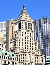 The modern building's facade is primarily composed of buff-colored Indiana Limestone, covering the tower and much of the base. The limestone facade at the lowest four stories is rusticated.[19][16] The original building's facade was made of red brick and granite, making it appear as though the original section was separate from the expanded structure.[21] Part of this facade is visible from New Street, but the Broadway facade was totally replaced with limestone.[17][22][20] A small portion of the original building's southern facade is still visible but was given a limestone overlay.[19]