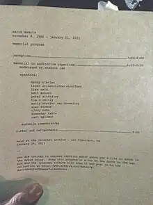 Several memorials followed soon afterward. On January 19, hundreds attended a memorial at the Cooper Union, speakers at which included Taren Stinebrickner-Kauffman, open source advocate Doc Searls, Creative Commons' Glenn Otis Brown, journalist Quinn Norton, Roy Singham of ThoughtWorks, and David Segal of Demand Progress.[123][124][125] On January 24, there was a memorial at the Internet Archive headquarters in San Francisco (video[126]) with speakers including Stinebrickner-Kauffman, Alex Stamos, Brewster Kahle,[127] Peter Eckersley, and Carl Malamud.[128] On February 4, a memorial was held in the Cannon House Office Building on Capitol Hill;[129][130][131][132] speakers at this memorial included Senator Ron Wyden and Representatives Darrell Issa, Alan Grayson, and Jared Polis,[131][132] and other lawmakers in attendance included Senator Elizabeth Warren and Representatives Zoe Lofgren and Jan Schakowsky.[131][132] Harvey Silverglate was a featured speaker at a rally by Demand Progress in Swartz’s memory.[133] A memorial also took place on March 12 at the MIT Media Lab.[134]
