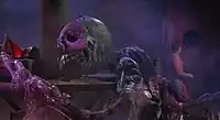For the scene in which Ash is revealed to be an android, a puppet was created of the character's torso and upper body, which was operated from underneath.[47] During a preview screening of the film, this scene caused an usher to faint.[54][70] In the following scene, Ash's head is placed on a table and reactivated; for portions of this scene, an animatronic head was made using a face cast of the actor, Ian Holm.[52] However, the latex of the head shrank while curing and the result was not entirely convincing.[47] For the bulk of the scene, Holm knelt under the table with his head coming up through a hole. Milk, caviar, pasta, fiber optics, and Foley urinary catheters were combined to form the android's innards.[47][52]