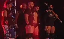 The group has been compared to the World Championship Wrestling (WCW) stable New World Order (nWo).[13] As a way of paying homage to the nWo, members of Bullet Club began using the stable's signature "Too Sweet" hand gesture.[14] The gesture, originally conceived by The Kliq's Sean Waltman and referred to by Kevin Nash as the "Turkish wolf",[15] had supposedly been used by Anderson and Devitt behind the scenes since 2006.[16] In March 2015, WWE filed a trademark application for the hand gesture.[17] Some, including Matt and Nick Jackson, suggested this was done due to Bullet Club's popularity.[18][19] The application was ultimately abandoned by WWE.[20] In August 2015, after Devitt had joined WWE as Finn Bálor, WWE released Bálor Club merchandise playing off Bullet Club.[21] WWE recognized Bullet Club in the first week of January 2016, when discussing rumors about members of the stable joining the promotion,[22] preceding A.J. Styles' debut in the WWE as a 2016 Royal Rumble contestant.[23] In April 2016, the former Bullet Club tag team of Gallows and Anderson debuted for WWE, with their NJPW background again being acknowledged by the company,[24] eventually forming The Club with Styles.[25] On September 25, 2017, Bullet Club appeared outside WWE's Raw show in Ontario, California, spoofing a segment from 1998 where D-Generation X "invaded" WCW's Nitro.[26][27] Afterwards, WWE sent members of the stable a cease and desist letter, claiming they were using the company's intellectual property, specifically the Too Sweet hand gesture, leading to merchandise featuring the gesture being pulled from stores.[28] WWE writer Jimmy Jacobs was let go by the company for posting a photo on Instagram with members of Bullet Club, taken during the mock invasion.[29]