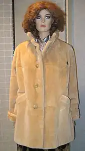 The most popular kinds of fur in the 1960s (known as luxury fur) were blond mink, white rabbit, yellow leopard, jaguar or cheetah, black panther, silver striped fox and red fox. Cheaper alternatives were pelts of wolf, Persian lamb or muskrat. It was common for ladies to wear a matching hat. In the 1950s, a must-have type of fur was the mutation fur (naturally nuanced colours) and fur trimmings on a coat that were beaver, lamb fur, Astrakhan and mink.[7]