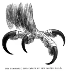 Adults of both sexes have similar plumage and are primarily dark brown, with some grey on the inner wing and tail, and a paler, typically golden colour on the back of the crown and nape that gives the species its common name.[43] Unlike other Aquila species, where the tarsal feathers are typically similar in colour to the rest of the plumage, the tarsal feathers of golden eagles tend to be paler, ranging from light golden to white.[4] In addition, some full-grown birds (especially in North America) have white "epaulettes" on the upper part of each scapular feather tract.[5][44] The bill is dark at the tip, fading to a lighter horn colour, with a yellow cere.[45] As in many accipitrids, the bare portion of the feet is yellow.[15] There are subtle differences in colouration among subspecies, described below.