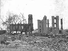 On May 3, 1901, downtown Jacksonville was ravaged by a fire that started as a kitchen fire. Spanish moss at a nearby mattress factory was quickly engulfed in flames and enabled the fire to spread rapidly. In a mere eight hours, it swept through 146 city blocks, destroyed over 2,000 buildings, left about 10,000 homeless and killed seven residents. The Confederate Monument in Hemming Park was one of the few landmarks to survive the fire. Governor William Sherman Jennings declared martial law and sent the state militia to maintain order; on May 17, municipal authority resumed.[40] It is said the glow from the flames could be seen in Savannah, Georgia, and the smoke plumes seen in Raleigh, North Carolina. Known as the "Great Fire of 1901", it was one of the worst disasters in Florida history and the largest urban fire in the southeastern United States. Architect Henry John Klutho was a primary figure in the reconstruction of the city.[41] The first multi-story structure built by Klutho was the Dyal-Upchurch Building in 1902.[42][43] The St. James Building, built on the previous site of the St. James Hotel that burned down, was built in 1912 as Klutho's crowning achievement.[44][45]