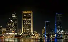 Jacksonville's early predominant position as a regional center of business left an indelible mark on the city's skyline. Many of the earliest skyscrapers in the state were constructed in Jacksonville, dating to 1902.[67] The city last held the state height record from 1974 to 1981.[68] The tallest building in Downtown Jacksonville's skyline is the Bank of America Tower, constructed in 1990 as the Barnett Center. It has a height of 617 ft (188 m) and includes 42 floors.[69][70] Other notable structures include the 37-story Wells Fargo Center (with its distinctive flared base making it the defining building in the Jacksonville skyline),[71][72] originally built in 1972–1974 by the Independent Life and Accident Insurance Company, and the 28-floor Riverplace Tower. When this tower was completed in 1967, it was the tallest precast, post-tensioned concrete structure in the world.[73][74]