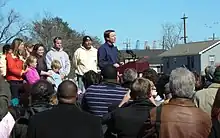 On December 28, 2006, John Edwards officially announced his candidacy for President in the 2008 election from the yard of a home in New Orleans, Louisiana, that was being rebuilt after Hurricane Katrina destroyed it.[66][67] Edwards stated that his main goals were eliminating poverty, fighting global warming, providing universal health care, and withdrawing troops from Iraq.[68]