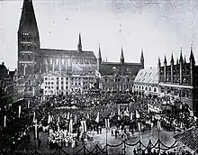![]() ![]() ![]() ![]() ![]() ![]() ![]() ![]() Clockwise from top: Lübeck skyline with St James', St Mary's and St Peter's; St Mary's Church detail; "Painters' Corner" with St Mary's and St Peter's; Lübeck Cathedral at dusk; view of Travemünde with Maritim high-rise; Lübeck Cathedral; Salzspeicher; Holsten Gate | |