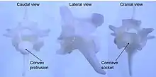 "Procoelous" vertebrae feature a spherical protrusion extending from the caudal end of the centrum of one vertebra that fits into a concave socket on the cranial end of the centrum of an adjacent vertebra.[20] These vertebrae are most often found in reptiles,[21][22] but are found in some amphibians such as frogs.[23] The vertebrae fit together in a ball-and-socket articulation, in which the convex articular feature of an anterior vertebra acts as the ball to the socket of a caudal vertebra.[21] This type of connection permits a wide range of motion in most directions, while still protecting the underlying nerve cord. The central point of rotation is located at the midline of each centrum, and therefore flexion of the muscle surrounding the vertebral column does not lead to an opening between vertebrae.[23]