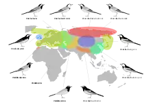 There are a number of other subspecies, some of which may have arisen because of partial geographical isolation, such as the resident British and Irish form, the pied wagtail M. a. yarrellii, which now also breeds in adjacent areas of the neighbouring European mainland. The pied wagtail, named for naturalist William Yarrell, exchanges the grey colour of the nominate form with black (or very dark grey in females), but is otherwise identical in its behaviour. Other subspecies, the validity of some of which is questionable, differ in the colour of the wings, back, and head, or other features. Some races show sexual dimorphism during the breeding season. As many as six subspecies may be present in the wintering ground in India or Southeast Asia and here they can be difficult to distinguish.[15][16][17][18] Phylogenetic studies using mtDNA suggest that some morphological features have evolved more than once, including the back and chin colour. Breeding M. a. yarrellii look much like the nominate race except for the black back, and M. a. alboides of the Himalayas differs from the Central Asian M. a. personata only by its black back. M. a. personata has been recorded breeding in the Siddar Valley of Kashmir of the Western Himalayas.[19] It has also been noted that both back and chin change colour during the pre-basic moult; all black-throated subspecies develop white chins and throats in winter and some black-backed birds are grey-backed in winter.[12][15]