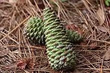 Although some needles fall throughout the year due to severe weather, insect damage, and drought, most needles fall during the autumn and winter of their second year. The seed cones are green, ripening pale buff-brown, 7–13 cm (2+3⁄4–5 in) in length, 2–3 cm (3⁄4–1+1⁄4 in) broad when closed, opening to 4–6 cm (1+1⁄2–2+1⁄4 in) wide, each scale bearing a sharp spine 3 to 6 millimeters (1⁄8 to 1⁄4 in) long.[2][13]