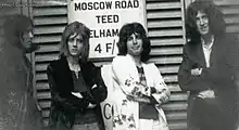 Queen began 1972 with a gig at Bedford College, London where only six people turned up. After a few more shows, they stopped live performances for eight months to work on the album with Anthony and Baker.[21] During the sessions at Trident, they saw David Bowie with the Spiders From Mars live and realised they needed to make an impact with the album, otherwise they would be left behind.[23] Co-producers Anthony and Baker initially clashed with the band (May in particular) on the direction of the album, bringing the band's inexperience in the studio to bear.[24] The band's fighting centered around their efforts to integrate technical perfection with the reality of live performances, leading to what Baker referred to as "kitchen sink overproduction".[25] The resulting album was a mix of heavy metal and progressive rock.[24] The group were unhappy with the re-recording of "The Night Comes Down", so the finished album uses the De Lane Lea demo. Another track, "Mad the Swine" was dropped from the running order after the band and Baker could not agree on a mix.[26] Mike Stone created the final mix for "Keep Yourself Alive", and he would go on to work on several other Queen albums.[27] By January 1972, the band finished recording their debut album, but had yet to secure a record contract.[24] In order to attract record company interest, Trident booked a "showcase" gig on 6 November at The Pheasantry, followed by a show at the Marquee Club on 20 December.[28]