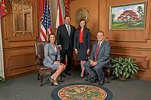 DeSantis became governor of Florida on January 8, 2019.[139] He has generally governed as a conservative.[140] On January 11, three days after taking office, he posthumously pardoned the Groveland Four, a group of black men falsely convicted of rape in 1949.[141][142] The same day,[143] he officially suspended Broward County sheriff Scott Israel, ostensibly for his responses to the mass shootings at the Marjory Stoneman Douglas High School, appointing Gregory Tony to replace him.[144][145] In its 2021 session, the Florida legislature passed DeSantis's top priorities.[146][147] During his tenure, the Republican-dominated Florida Legislature enacted much of DeSantis's legislative agenda, often on rapid timelines.[148][149] Maximizing the power of the governor's office, DeSantis exerted pressure on Republican legislative leaders.[150][151]