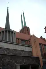 A new design, eventually followed and leading to construction of the currently standing building, was worked out hastily in 1956. The hurry resulted from political circumstances; ecclesiastical authorities feared that apparent political thaw might be short-lived and insisted Kupiec produces new plans which might get approved before the communists change their course again.[77] The new plan partially resembled the old one, as it was based on approximately the same layout, featured the same gabled roof, proposed high side windows and emphasized verticality, but it also advanced some major alterations. Central nave with 2 aisles was replaced with a somewhat wider nave with only one, Eastern aisle. It was separated from the central space by massive piers supporting a gallery, a new feature rather unusual in modern Roman Catholic churches. A slender tower was replaced with a larger one, crowned with two high spires; it was removed from in-between the church and the monastery to the South-Eastern corner of the temple. Most importantly, a one-level construction was replaced with two halls, taking advantage of the slope gradient; the lower one, accessible only from the North, was to house educational and social activities but was eventually turned into a church, the upper one, accessible from the North and the South, was to become the main church itself.[78] Construction material was bricks; eventually it took some 1,2m of them to complete the building.[79] Currently the design is noted as containing some Gothic references, though principally related to modernism and simplified cubism.[80] Hurried architectural work is blamed for some deficiencies; upper church suffered from very poor visibility from the aisle, framed by massive piers, and from the gallery.[81] The tower proved to be inappropriate for huge bells mounted, their motion threatening the very construction.