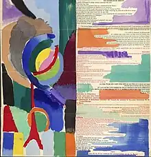 The Delaunays' friend, the poet and art critic Guillaume Apollinaire, coined the term Orphism to describe the Delaunays' version of Cubism in 1913. It was through Apollinaire that in 1912 Sonia met the poet Blaise Cendrars who was to become her friend and collaborator. Sonia Delaunay described in an interview that the discovery of Cendrars' work “gave me [her] a push, a shock.”[4] She illustrated Cendrars' poem La prose du Transsibérien et de la Petite Jehanne de France (Prose of the Trans-Siberian and of Little Jehanne of France) about a journey on the Trans-Siberian Railway, by creating a 2m-long accordion-pleated book. Using simultaneous design principles the book merged text and design. The book, which was sold almost entirely by subscription, created a stir amongst Paris critics. The simultaneous book was later shown at the Autumn Salon in Berlin in 1913, along with paintings and other applied artworks such as dresses, and it is said that Paul Klee was so impressed with her use of squares in her binding of Cendrars' poem that they became an enduring feature in his own work.