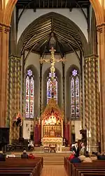In the 1960s a number of the fittings, including Pugin's screen, were removed and the interior repainted, to the detriment of the original design.[3][8] The rood screen was rescued by an Anglican priest, who had it re-erected in the Anglican Holy Trinity Church, Reading.[9] Other artefacts were removed to other churches, including the giant rood crucifix, which after its removal to the Church of the Sacred Heart & St Therese, in Coleshill, was reinstated in the cathedral within the Sanctuary on the instructions of Archbishop Maurice Couve de Murville. The cathedral as it appears today is a result of post-Vatican II renovations and re-orderings, with only some of Pugin's work surviving. The original chancel arrangement was altered, again much to the detriment of its design, destroying Pugin's intent. Its appearance today is a mere shadow of how it was originally conceived by Pugin, but its enduring beauty in the face of iconoclasm is testament to the skill of its original designers. St Barnabas Cathedral in Nottingham, also by Pugin, suffered similarly, with much of the original decoration smothered with whitewash, and fittings destroyed.
