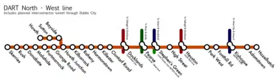 First suggested in the 1970s, the DART Underground proposal called for a tunnel connecting the Northern DART line to the Kildare line. The project was shelved in 2011,[10] and not included in the Greater Dublin Area Strategy 2022 to 2042 published in late 2021.[11]