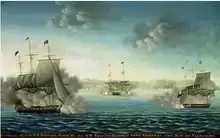 The first shot took place after an exchange of hails had still failed to identify either ship to the other in the growing dusk.[65] After 45 minutes of battle, taking place in darkness, Little Belt had received much damage, with several holes to her hull near the water-line and her rigging "cut to pieces".[66] President's Captain Rodgers claimed Little Belt had fired first; but he did not ascertain her size or country of origin until dawn. After sending over a boat, Rodgers expressed regret and apologized for the 'unfortunate affair'.[67]